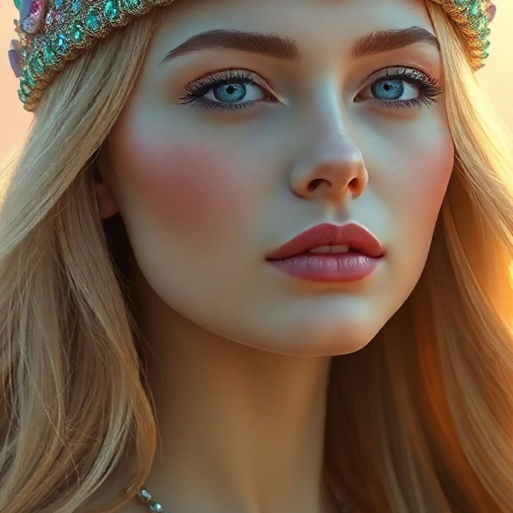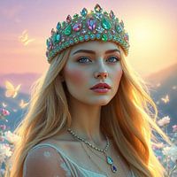Dit kunstwerk straalt magische elegantie en verfijning uit. Een vrouw met een prachtige edelstenen kroon en ketting, haar blonde lokken zacht omlijst door een romantische roze achtergrond, versierd met fladderende vlinders. Haar diepblauwe ogen geven een intrigerende en krachtige uitstraling, waardoor het een perfecte toevoeging is voor een interieur dat schoonheid, luxe en natuurlijke harmonie omarmt.