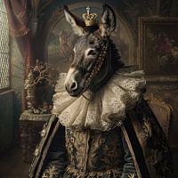 Deze buitengewone afbeelding van een ezel in koninklijke kleding combineert humoristische creativiteit met artistieke elegantie. De ezel draagt een prachtige kroon en barokke gewaden, rijkelijk versierd met fijne details en uitgebreide versieringen. Ideaal voor kunstliefhebbers en verzamelaars die houden van ongewone en grillige werken. Dit schilderij brengt een vleugje koninklijke pracht en een vleugje humor in elk huis of kantoor.