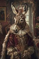 Deze buitengewone afbeelding van een ezel in koninklijke kleding combineert humoristische creativiteit met artistieke elegantie. De ezel draagt een prachtige kroon en barokke gewaden, rijkelijk versierd met fijne details en uitgebreide versieringen. Ideaal voor kunstliefhebbers en verzamelaars die houden van ongewone en grillige werken. Dit schilderij brengt een vleugje koninklijke pracht en een vleugje humor in elk huis of kantoor.