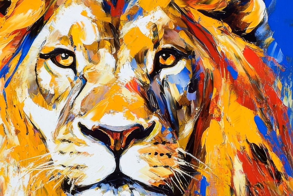 De leeuw staart majestueus vanuit een zee van levendig blauw, zijn prachtige gouden kroon bevestigt zijn heerschappij. De felle, vurige kleuren van zijn vacht stralen kracht en gratie uit, terwijl zijn doordringende ogen een verhaal van moed en wijsheid vertellen. Een majestueus symbool van koninklijkheid in de dierenwereld.
