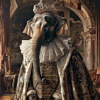 Deze majestueuze afbeelding van een olifant in koninklijke kleding combineert humoristische creativiteit met artistieke elegantie. De olifant draagt een prachtige kroon en barokke gewaden, rijkelijk versierd met kostbare details en uitgebreide versieringen. Ideaal voor kunstliefhebbers en verzamelaars die houden van ongewone en grillige werken. Dit schilderij brengt koninklijke pracht en een vleugje humor in elk huis of kantoor.
