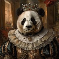 Dit indrukwekkende kunstwerk toont een majestueuze panda in weelderige barokke kleding, gekroond en vol koninklijke pracht en praal. De liefdevolle details van het rijkelijk versierde gewaad en de elegante pose van de panda creëren een perfecte symbiose van humor en elegantie. Een unieke blikvanger die zowel creativiteit als koninklijke gratie uitstraalt. Ideaal voor kunstliefhebbers en verzamelaars die een buitengewoon tintje aan hun kamer willen geven.