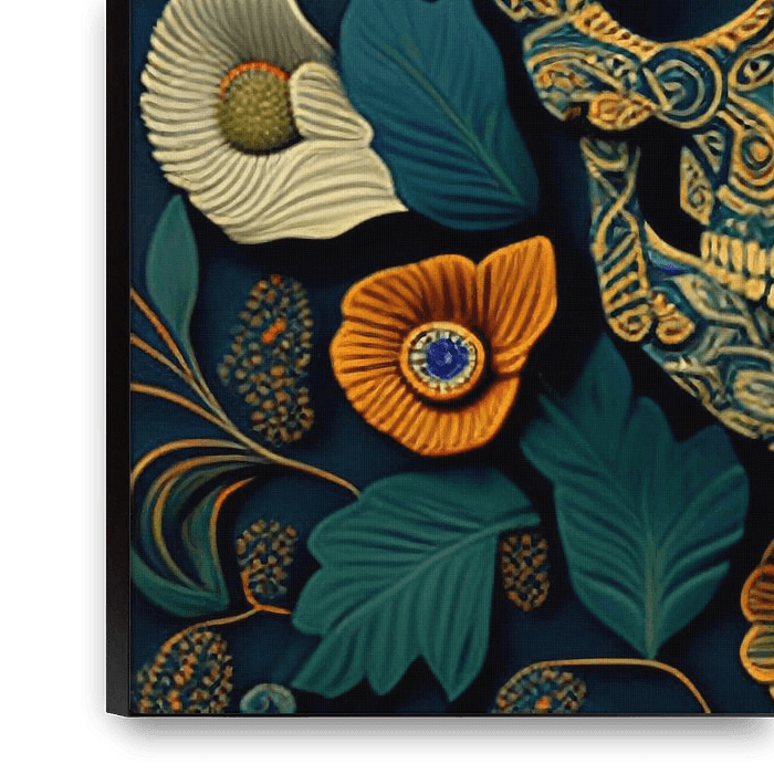 Dit schilderij toont een prachtige schedel versierd met bloemmotieven, die de cyclus van leven en dood symboliseren. De levendige bloemen tegen de donkere achtergrond roepen een harmonieuze mix op van sterfelijkheid en vernieuwing. Het ontwerp van de schedel bevat sierlijke patronen van bladeren en bloemen, die thema's van schoonheid,…