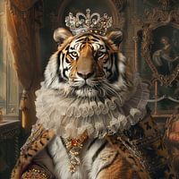 Dit indrukwekkende kunstwerk vangt de majestueuze aanwezigheid van een koninklijke tijger in al zijn pracht. Met een rijkelijk versierde kraag en een prachtige kroon toont de afbeelding de tijger als een nobele heerser. De gedetailleerde afbeelding en het verfijnde kleurenschema maken dit schilderij een perfect hoogtepunt voor elegante woonkamers of stijlvolle kantoren. Het geeft elke kamer een vorstelijke en luxueuze sfeer.