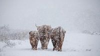 Drie Schotse hooglanders lopen in een besneeuwd landschap tijdens een flinke sneeuwbui. Ze zijn al gedeeltelijk wit van de sneeuw maar ze kunnen goed tegen de kou, deze temperatuur is juist ideaal voor deze dieren. Samen op weg, de kudde is heel hecht, ze zorgen altijd voor elkaar, het zijn kalme vriendelijke dieren. Deze Schotse…
