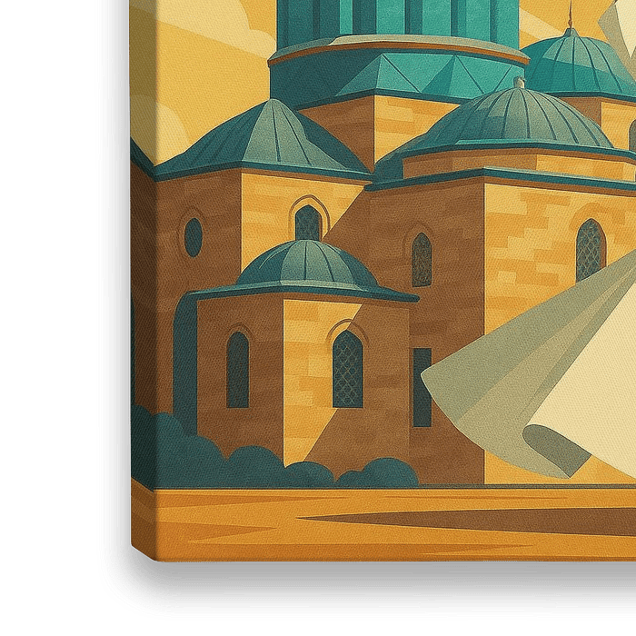 Deze art decoposter uit Konya legt het diepe spirituele erfgoed van de stad vast met een gracieuze afbeelding van een wervelende derwisj tegen de achtergrond van het Mevlana Museum. De compositie baadt in gouden licht met gestileerde balken die door de lucht stralen en combineert beweging, architectuur en culturele symboliek. De turquoise koepel van het mausoleum staat als een tijdloos embleem van Konya, terwijl de vloeiende dans van de derwisj thema's van toewijding, vrede en transcendentie oproept. Ontworpen in een vintage reisstijl, combineert dit kunstwerk strakke geometrische lijnen, warme tinten en gedurfde typografie voor een opvallende en gedenkwaardige esthetiek. Perfect voor verzamelaars van reisposters en bewonderaars van de Turkse cultuur. Dit Konya muurkunstwerk voegt diepte, sereniteit en elegantie toe aan elk interieur. Of het nu in een studeerkamer, woonkamer of creatieve werkruimte hangt, het viert zowel de architecturale schoonheid als de spirituele tradities die van Konya een unieke en inspirerende bestemming in Turkije maken.