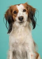 Portret van een Kooikerhondje tegen een turquoise blauwe achtergrond