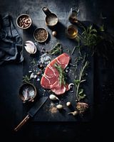 Kook jij vanavond?. Flatlay van een lekker stuk vlees en andere ingrediënten zoals kruiden. Super leuk om bijvoorbeeld in de keuken te hangen. Kies zelf het formaat en materiaal bij dit werk en maak er een echte blikvanger van in jouw interieur.