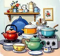 Details: keuken, pannen, ketel, vaatwerk, bloemen, rood, blauw, groen, geel, wit