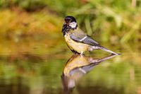 Koolmeesjes (Parus major) badend in een vijver in het voorjaar.