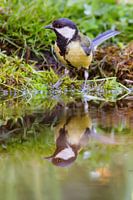 Koolmees (Parus major) zittend op de oever van een vijver in het voorjaar.
