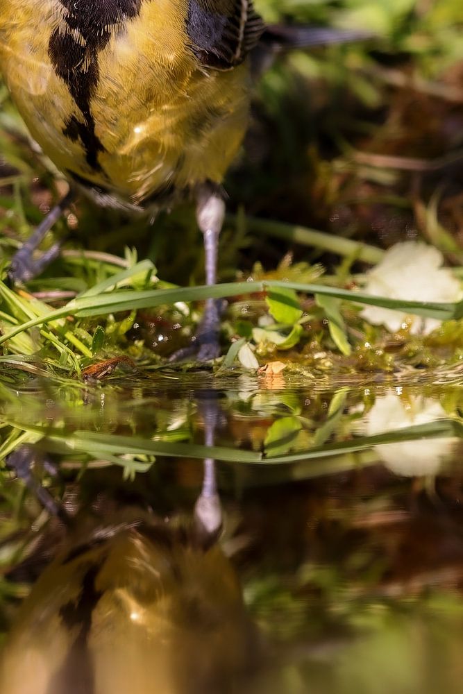 Koolmees (Parus major) zittend op de oever van een vijver in de lente.