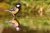 Koolmees (Parus major) zittend op de oever van een vijver in het voorjaar.