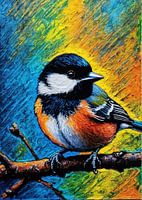 Een oliepastelweergave van een koolmees, met zijn opvallende zwart-witte kop, felgele buik en donkergroenachtige vleugels. De kunstenaar gebruikt zachte, gemengde streken om de ronde vorm en kenmerkende markeringen van de vogel te benadrukken. Het pasteleffect met textuur geeft de afbeelding een levendige, dynamische kwaliteit en benadrukt de alerte en nieuwsgierige aard van de vogel terwijl hij sierlijk neerstrijkt.