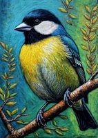 Een oliepastelweergave van een koolmees, met zijn opvallende zwart-witte kop, felgele buik en donkergroenachtige vleugels. De kunstenaar gebruikt zachte, gemengde streken om de ronde vorm en kenmerkende markeringen van de vogel te benadrukken. Het pasteleffect met textuur geeft de afbeelding een levendige, dynamische kwaliteit en benadrukt de alerte en nieuwsgierige aard van de vogel terwijl hij sierlijk neerstrijkt.