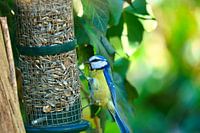 Koolmees bij een voederplek. Vogelsoorten met zwarte kop en borst. Vinkensoort. Dierenfoto uit de natuur