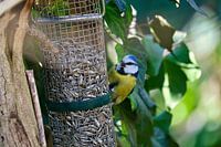 Koolmees bij een voederplek. Vogelsoorten met zwarte kop en borst. Vinkensoort. Dierenfoto uit de natuur