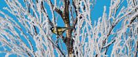 Een contrastrijke foto van een koolmees tussen de velen takken van een bevroren en witte berkenboom. Deze foto toont verassende kleurcontrasten tussen het gele koolmeesje, witte ijzige boomtakken en een strakblauwe lucht. "Koolmees in de kou" is een schitterend fotobeeld voor de vogelliefhebber en voor de liefhebber van moderne- en minimalistische kunst.