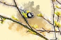 Digitaal mixed media kunstwerk van een mannetjes koolmeesje op een tak, tussen de gele bloesem.