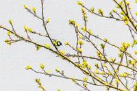 Digitaal mixed media schilderij van een koolmeesje tussen de gele bloesemtakken van een boom.