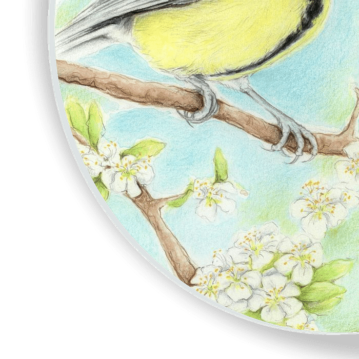 Natuurgetrouwe illustratie in aquarel en kleurpotlood van een koolmeesje op een bloesemtak in de lente. Een illustratie met zachte pastelkleuren in lente sfeer.
