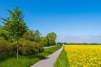 Koolzaadveld, fietspad en weg met bomen bij Parkentin.