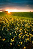 Zonsondergang over een koolzaadveld bij Feldberg in het Mecklenburgse merengebied