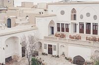 Een binnenplaats van een traditioneel Perzisch koopmanshuis in Kashan in Iran. Kashan is een middelgrote woestijnstad aan de zijderoute in Iran. De stad ligt in een oase. Dit koopmanshuis heeft de bouw van typische oude Perzische architectuur. De gebouwen zijn licht van kleur. Deze foto hebben we gemaakt tijdens onze reis door Iran tijdens noroez. Noroez betekent 'nieuwe dag' en is het Perzisch Nieuwjaar. Dit valt samen met het begin van de lente op 21 maart. De mensen hebben dan twee weken vrij en gaan op familiebezoek door het hele land. Het is dan ook ontzettend druk overal. Iran is een prachtige reisbestemming waar ontzettend vriendelijke en behulpzame mensen wonen. Deze foto is uitgevoerd in lichte pastel kleurtinten zoals beige en wit en geeft een goed beeld hoe de Perzische architectuur eruit ziet.