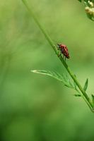 De wants beklimt deze stengel als een koorddanser die balanceert boven een afgrond. De wazige groene achtergrond geeft rust aan het beeld, maar de grote lege ruimte aan de onderkant geeft het gevoel van een diepe afgrond. De spanning brengt het beeld in evenwicht.