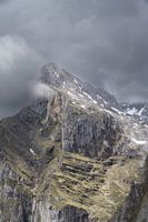 De top, die gedeeltelijk met sneeuw bedekt is, wordt omgeven door donkere en dreigende wolken, wat de scène een dramatische sfeer geeft. De steile, verticale rotswanden zijn grijs van kleur, terwijl de lagere delen van de berg hellingen hebben die begroeid zijn met groen gras en mos.