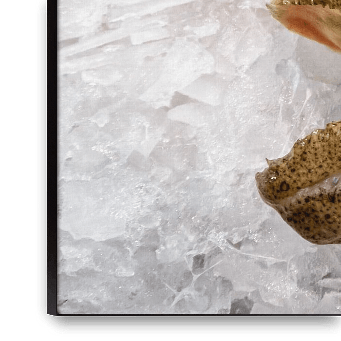 Koop de foto Kop met mond en oog van tarbot op ijs op de markt van Dieter Walther op canvas, aluminium dibond, (ingelijste) fotoprint, behang en ArtFrame, op maat geprint in Fine-Art kwaliteit.