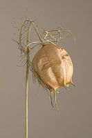 Koop dit bloemen kunstwerk Kop op! Een gedroogd juffertje-in-het-groen laat zijn hoofdje hangen van Marjolijn van den Berg op canvas, aluminium dibond, (ingelijste) fotoprint, behang en ArtFrame, op maat geprint in Fine-Art kwaliteit.