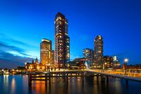 Rotterdam skyline met Hotel New York op de Kop van Zuid gezien vanaf de Kaap Katendrecht. Gemaakt tijdens zonsondergang voor typisch koele blauwe lucht tegen de warme verlichting van de stad.