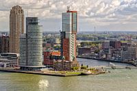 De "Kop van Zuid" in Rotterdam. Moderne architectuur en wolkenkrabbers alwaar de Havendienst van Port of Rotterdam zetelt. Aan het einde van de pier het Hotel New York met aan de kade de historische Zeesleper MS. Holland.