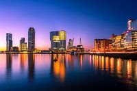 De Kop van Zuid tijdens een prachtige zonsondergang. Mooie heldere paarse en blauwe kleuren steken af tegen de gele lichten uit alle gebouwen.