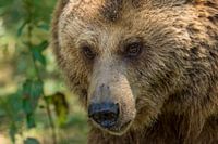 Detail foto van een de kop van een bruine beer met wat bladeren op de achtergrond