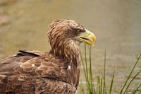Kop van een Europese Zeearend , aan de gele snavel hangt een druppel water. Goud, geel en groene kleuren. Gras en water in de achtergrond.