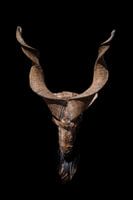 Kop van een geit met grote hoorns (Markhor) en een baard geïsoleerd op een zwarte achtergrond, symbool van de hel en het satanisme. Close-up.