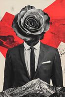 Een stijlvol geklede man met een majestueuze rozenkop belichaamt een fascinerende symbiose van elegantie en natuur. De intens rode tint op de achtergrond voegt een vleugje drama toe, terwijl de besneeuwde bergen zorgen voor een serene, tijdloze achtergrond. Hier komen menselijke essentie en bloemenpracht samen in een krachtig visueel statement.