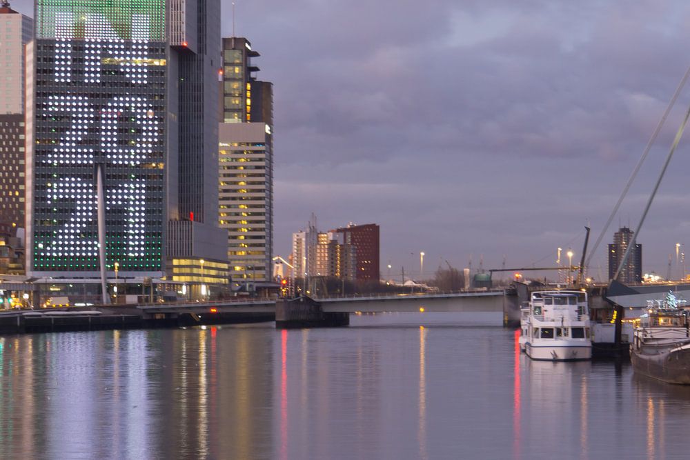 Foto gemaakt vanuit de koningshaven bij zonsopkomst. Op de achtergrond uiterst links de maastoren. In het midden de toren op zuid met verlichtte tekst en rechts de Erasmusbrug