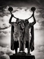 De foto toont het beeldhouwwerk Lurblæserne ("De Lurenblazers"), dat sinds 1914 op de Rådhusplads in het centrum van Kopenhagen staat.