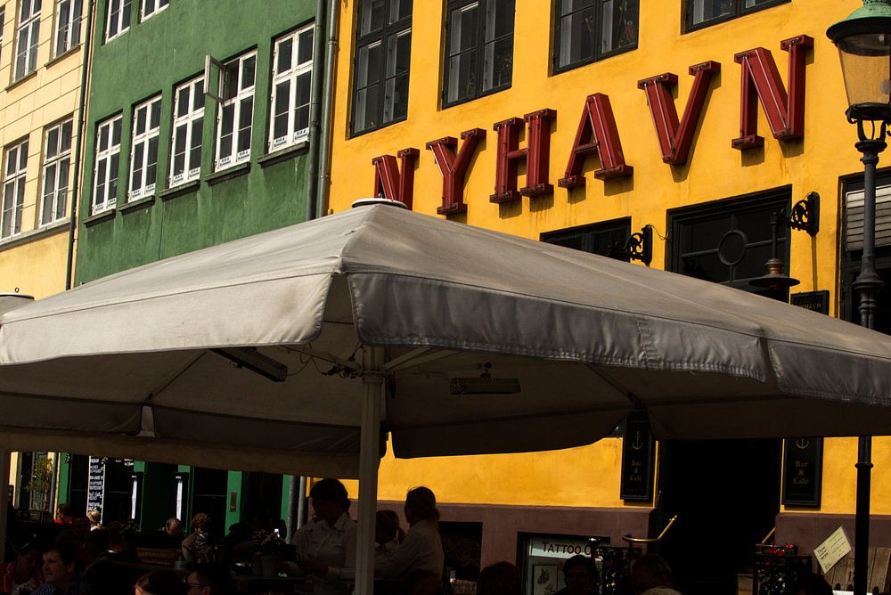 Nyhavn, de 'nieuwe haven' in Kopenhagen. Een aaneenschakeling van kleurrijke huisjes. Ze worden nu vooral gebruikt als café en restaurant. Bij mooi weer, zoals op deze dag, zijn de terrasjes goed gevuld.