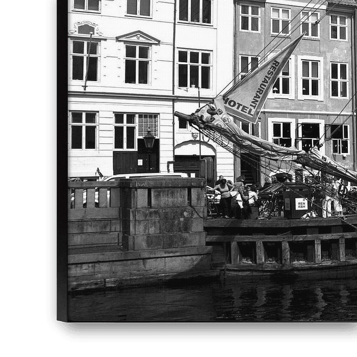 Een schip in Nyhavn, de 'nieuwe haven' van Kopenhagen, Denemarken. Bekend om haar gekleurde huizen die nu vooral gebruikt worden voor horeca-gelegenheden. Omgezet naar zwart wit wordt het contrast tussen de verschillende gebouwen sterker, en het beeld rustiger.