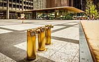 Koperen brandslang aansluitingen op het plein met in de achtergrond de Apple Store die aan de Chicago River ligt. De lijnen trekken het beeld naar 1 punt. De foto is genomen in 2018, laat in het voorjaar.