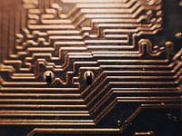 een close-up van de koperen banen op een moederbord. deze voeren de electra van en naar de componenten die op het moederbord zijn gesoldeerd
