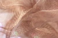 Deze macrofoto toont een fijne, semi-transparante stof in een warme beige kleur. De netachtige structuur bestaat uit regelmatige lijnen die een filigraan raster vormen. Op de achtergrond zijn zachte lichtreflecties en bokeh-effecten te zien, die het beeld een zachte, bijna droomachtige diepte geven.