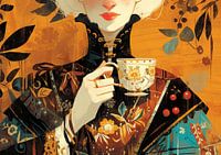 Floral Elegance - Dit vrouwen schilderij toont een elegante dame met bleke huid en roodgekleurde lippen, gekleed in een kleurrijk, gedetailleerd kledingstuk met bloemenmotieven, terwijl ze sierlijk een versierde porseleinen kop vasthoudt.