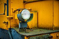 Koplamp van een oude rangeertrein dichtbij gefotografeerd. Het is een onderdeel van een oude locomotief uit vervlogen tijden die gerestaureerd is.