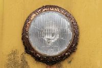 Een verweerde koplamp als studie in patina en textuur. Roest kruipt langs de rand van metaal en glas en maakt van een functioneel onderdeel een object met karakter. De warme geel-oker tinten geven het beeld een rustige samenhang, terwijl de fijne korrel van oxidatie en de sporen van gebruik dichtbij tot leven komen. Door de kadrering is…