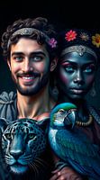 Portret > Paar met panter en papegaai > Een mooi paar van verschillende nationaliteiten is afgebeeld met een panter en een papegaai. Het stel met een lichtgetinte man met golvend haar en groene ogen, als een donkergetinte, mooie vrouw met blauwe ogen. De man draagt een zilveren ring en een bloem in zijn haar om de diversiteit van mannelijke schoonheid te laten zien. De dieren geven de afbeelding een jungle-karakter. Het geheel is een statement over het leven met al zijn schoonheid en diversiteit.